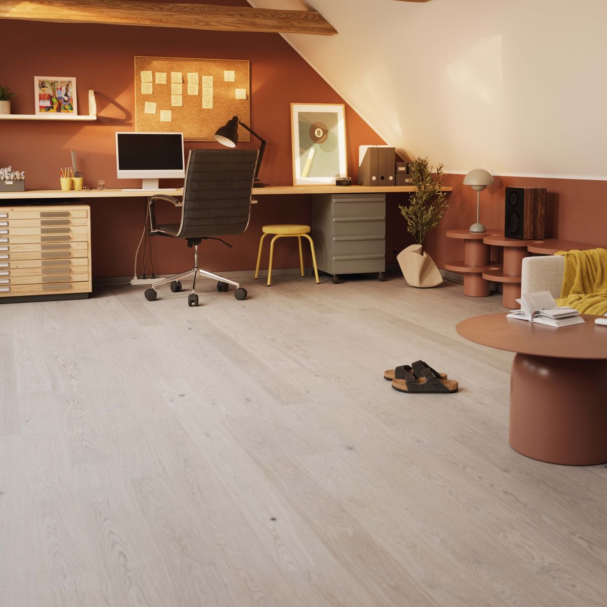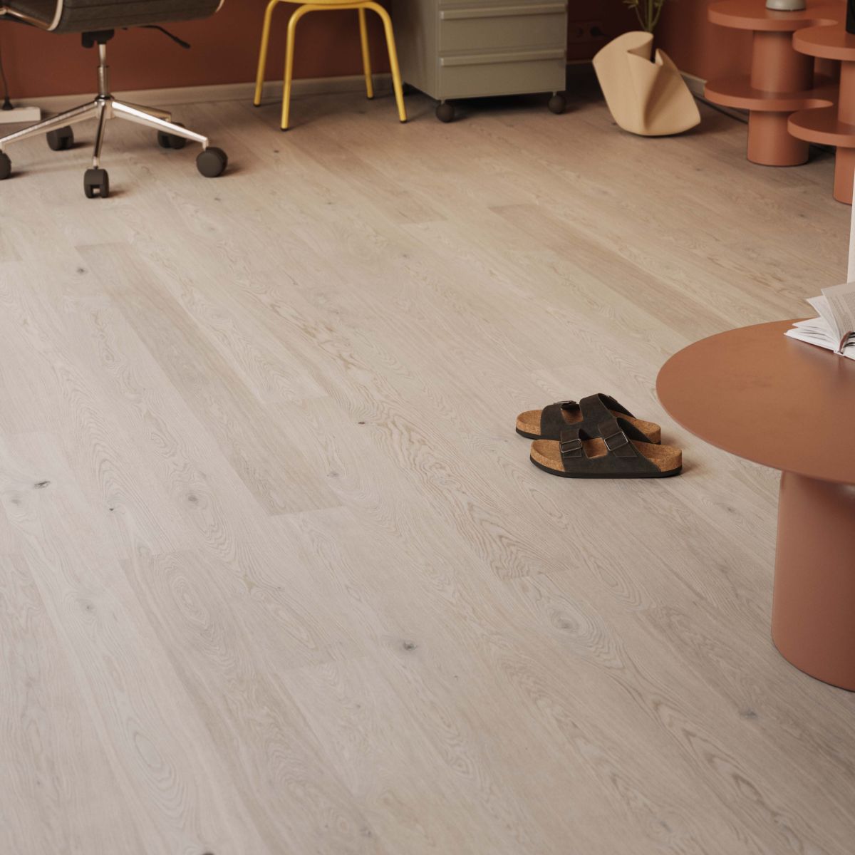 Dalen är ett ljust, mattlackat härdat trägolv som är mycket populärt i de skandinaviska länderna. Den mjuka nyansen, Powder White, ger en ljus känsla och Blended sorteringen, som kännetecknas av mindre variationer i nyans och struktur, bidrar till att ge golvet karaktär. Denna klass 33-produkt är tillverkad av FSC-certifierad europeisk ek och är extremt slitagetålig och idealisk för livliga utrymmen som hotell, butiker, kontor och kaféer – eller på de ställen i hemmet där golvet behöver klara lite extra. Den mattlackade ytan skyddar mot fläckar och gör golvet lätt att underhålla.