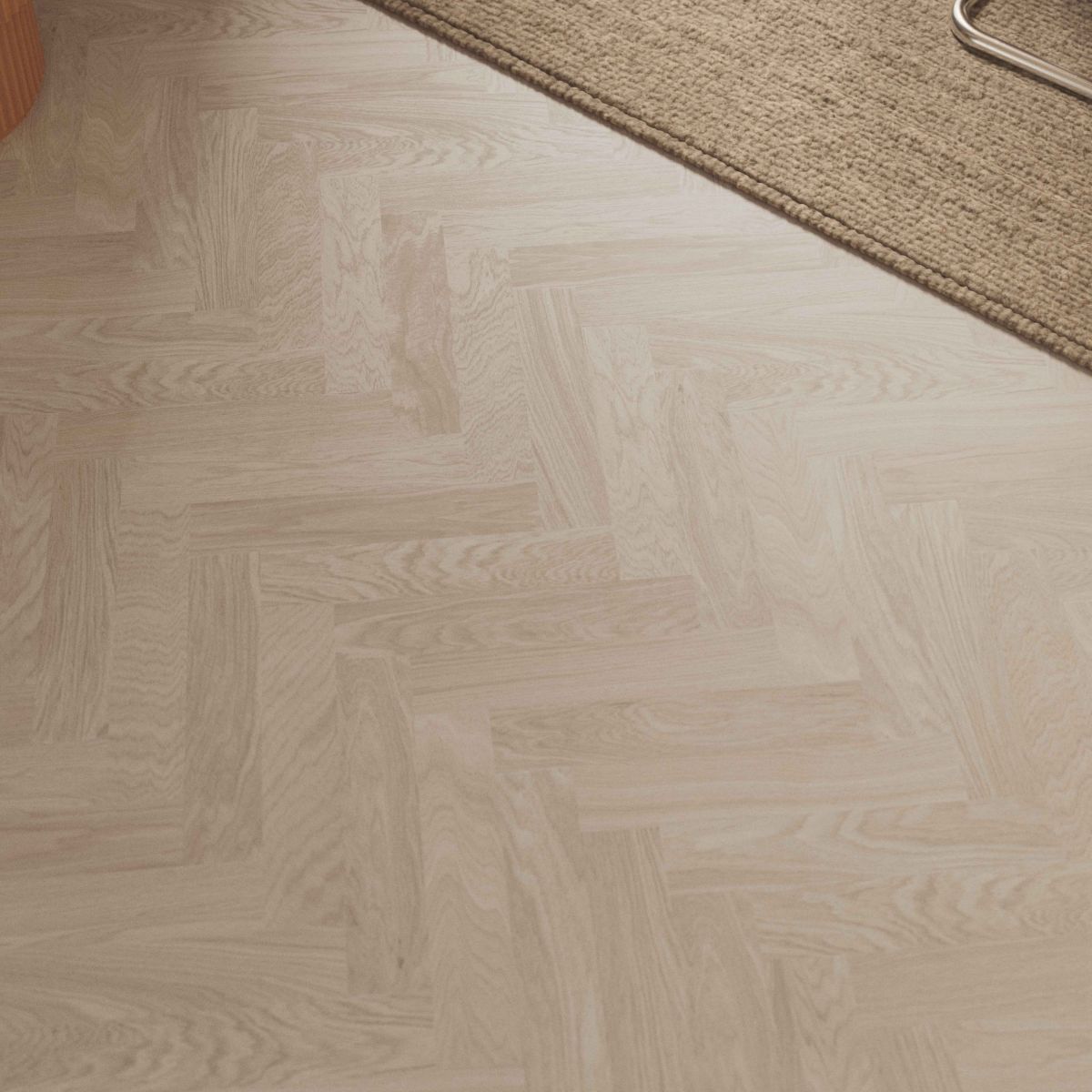 Boden är ett elegant Powder White Woodura Fiskben 3.0-golv i ett klassiskt stavformat. Med den rena och harmoniska Select-sorteringen skapas en modern känsla medan stilen Classic tillför traditionell elegans i alla miljöer.