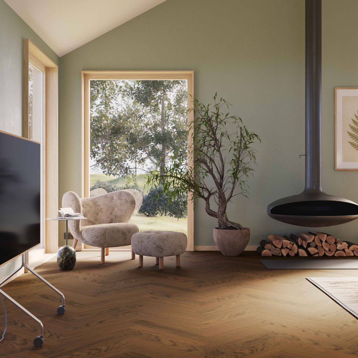 Sandviken är ett modernt Woodura Fiskben 3.0-golv i den varma nyansen Terra Brown. Tillsammans med Select-sorteringen skapas en inbjudande och harmonisk känsla. Det större, moderna formatet ger ett djärvt och samtida uttryck, samtidigt som det tidlösa fiskbensmönstret bevaras.