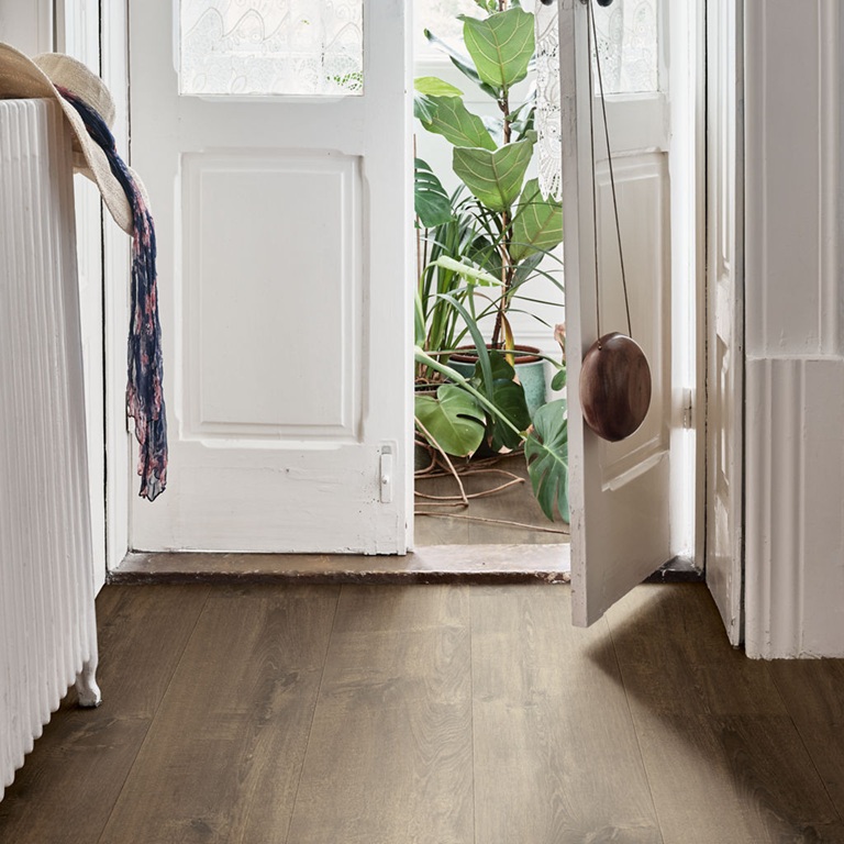 Lodge Oak är ett laminatgolv med en naturligt varierad ekdesign i en djup, gråaktig brun nyans. Golvet har stora kvistar och träådringar med ett något slitet, ruggat utseende, och en livlig variation som fångar naturens skönhet och för in den på ett sömlöst sätt i ditt hem. Torekov Lodge Oak ger det där exklusiva utseendet som du bara får från extra långa, extra breda plankor. Det har en 4-sidig fasning och passar särskilt bra i stora rum som vardagsrum. Torekov är ett Sensation-golv, vilket innebär att det har extra autentisk struktur och en sofistikerad matt yta. Det patenterade skyddslagret TitanX™ ger golvet hög motståndskraft mot repor och slitage. Och tack vare AquaSafe-tekniken är golvet vattentätt och bekymmersfritt. Torekov är snabbt och enkelt att lägga tack vare klicksystemet PerfectFold™.