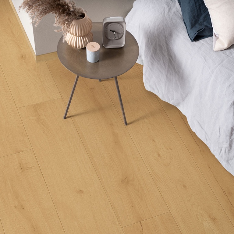 Smokewood Oak är ett laminatgolv som kombinerar den lätt rustika, väderbitna charmen hos drivved med en sofistikerad finish. De medelbruna ektonerna, med en aning röda undertoner ger ett modernt men ändå tidlöst uttryck. Golvet har distinkta träådringar och kvistar, men ger ändå ett lugnt intryck i alla rum. Visby är ett Sensation-golv, vilket innebär att det har extra autentisk struktur och en sofistikerad matt yta. Det patenterade skyddslagret TitanX™ ger golvet hög motståndskraft mot repor och slitage och tack vare AquaSafe-tekniken är golvet vattentätt och bekymmersfritt. Visby är snabbt och enkelt att installera med PerfectFold™ klicksystem.