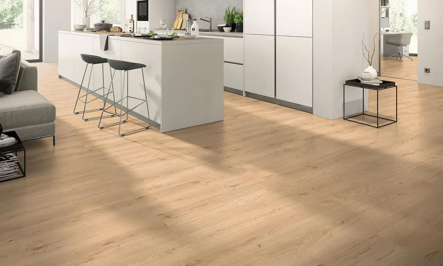 Vattentåligt laminatgolv i XXL – d.v.s. långa och XX-tra breda plankor. Kanterna är dessutom tätade så att fukt inte tränger in i fogarna. De fasade plankorna framhäver plankeffekten och ger ett exklusivt utseende. Golvet är lagt med det superlätta Megaloc aqua protect klicksystemet, vilket gör det enkelt att lägga golvet. Ett riktigt bra och vackert golv med ett naturligt utseende.